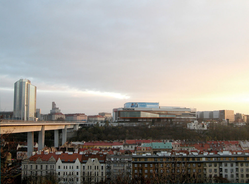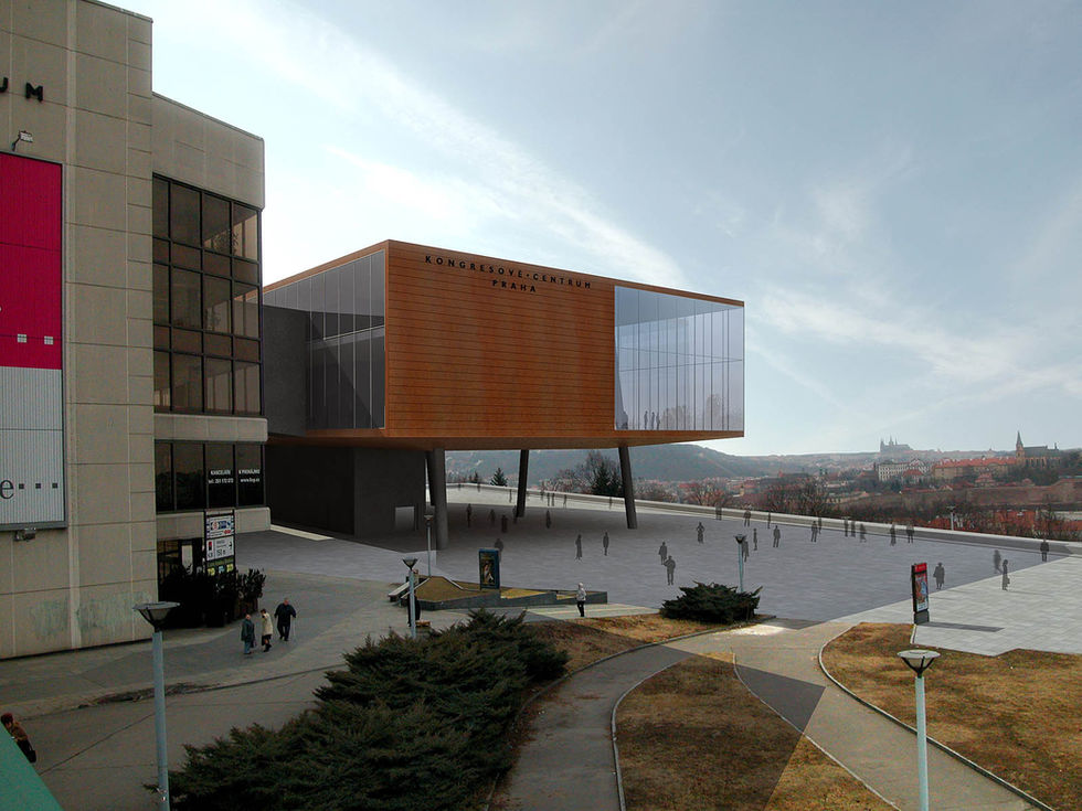 Budova se "vznáší" ve výšce 9m na deseti nakloněných sloupech nad terasou před severní fasádou stávajícího KCP. S terasou je pak dále propojena již jen dvěma komunikačními jádry. Pavilon je se stávající KCP propojen pomocí dvou spojovacích krčků. Toto řešení jednak umožňuje přímé propojení s hlavními podlažími stávajícího KCP a zachovává nenarušený volný průchod chodců ze stanice metra Vyšehrad k obytné zástavbě okolí. Výhled z této terasy na panorama historického jádra Prahy zůstává taktéž nenarušen.